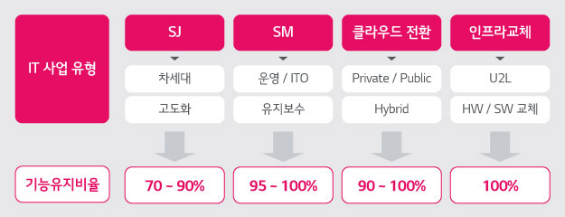 IT 프로젝트는 주로 SI(System Integration, 기업이 필요로 하는 정보시스템의 기획부터 개발, 구축, 운영까지 모든 서비스를 제공하는 일), SM(System Management, 회사 시스템이 문제 없이 작동하도록 시스템을 운영하고 유지 보수하는 일), 클라우드 마이그레이션(Cloud Migration, 서로 다른 클라우드 간 애플리케이션 및 데이터를 이전하는 과정), 인프라 고도화 4가지 유형으로 분류됩니다.