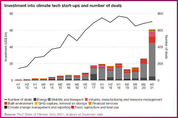 전세계 많은 투자자들이 기후테크를 미래 산업을 이끌 기술로 보고 있는데요. 실제로 대규모의 투자금이 기후테크에 몰리고 있습니다. PwC의 기후테크 현황 보고서(State of Climate Tech 2021)에 따르면, 2013년부터 2021년까지 기후테크 분야 누적 투자금 규모는 2,220억 달러에 달합니다. 기후테크 관련 스타트업 수는 3,000개가 넘으며 9,000번 이상의 투자가 이뤄졌습니다.