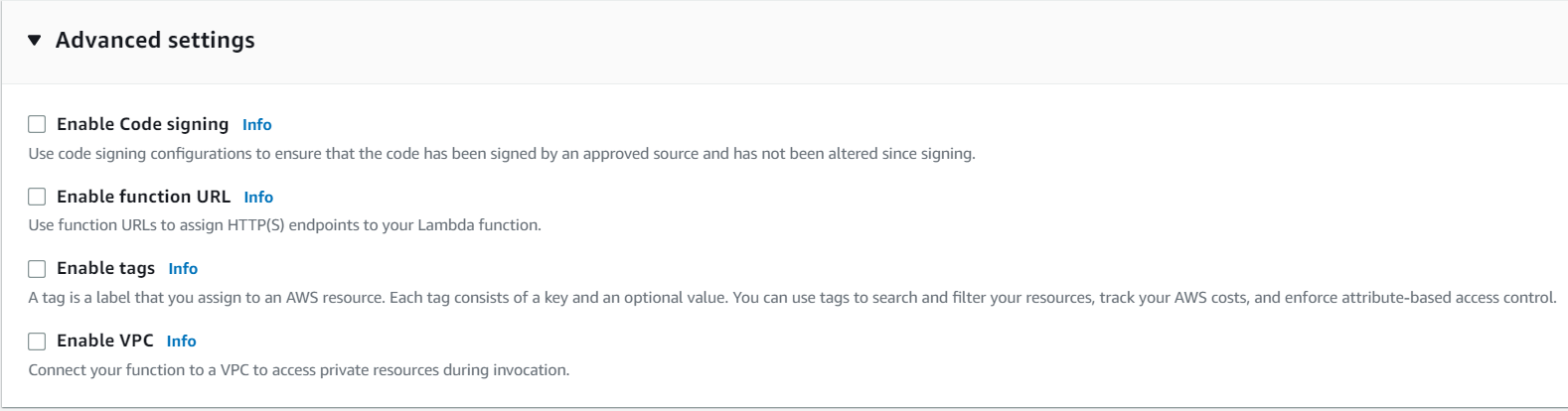 Advanced setting에는 lambda 구현 시 활용할 수 있는 다양한 옵션이 존재하는 데, 그중에서 강조하고 싶은 항목은 “Enable VPC”입니다.