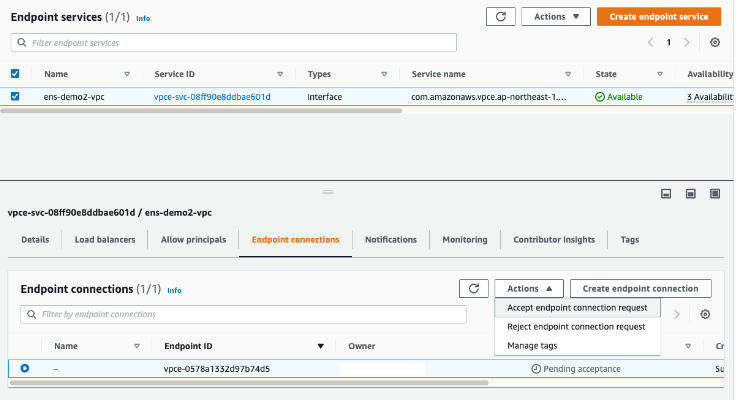 이전 스텝에서 Endpoint를 생성하고 나면, 기존에 생성하였던 Endpoint Service에서 승인(default 설정)을 해줘야 합니다.