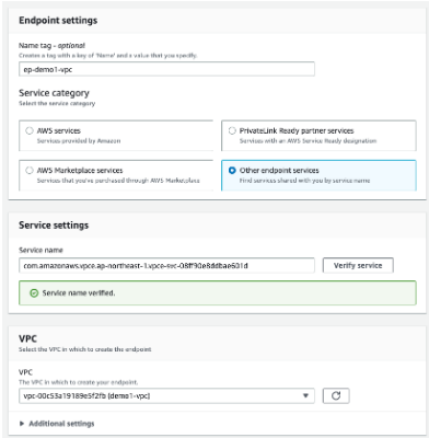 o Other enepoint services 선택 후, demo2-vpc에 생성하였던 Endpoint Service Name을 넣고 Verify service를 합니다.