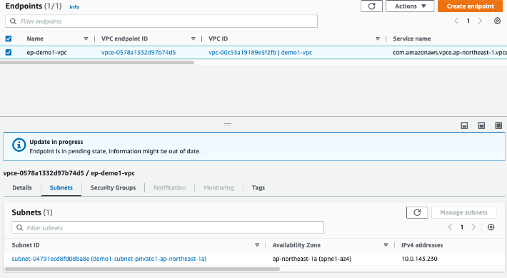 EC2가 위치하고 있는 demo1-vpc에서 RDS가 위치하고 있는 demo2-vpc에 생성된 Endpoint Service와 연결하기 위하여 Endpoint를 생성합니다.