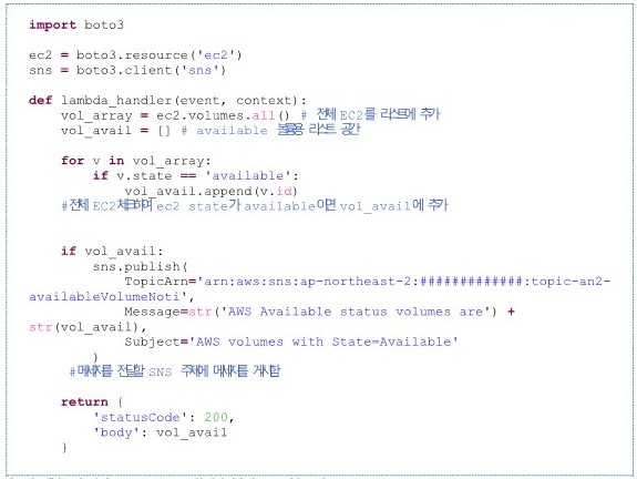 다음은 Python 코드로 작성한 Available Volume Check 코드를 Lambda function 예제 코드입니다.