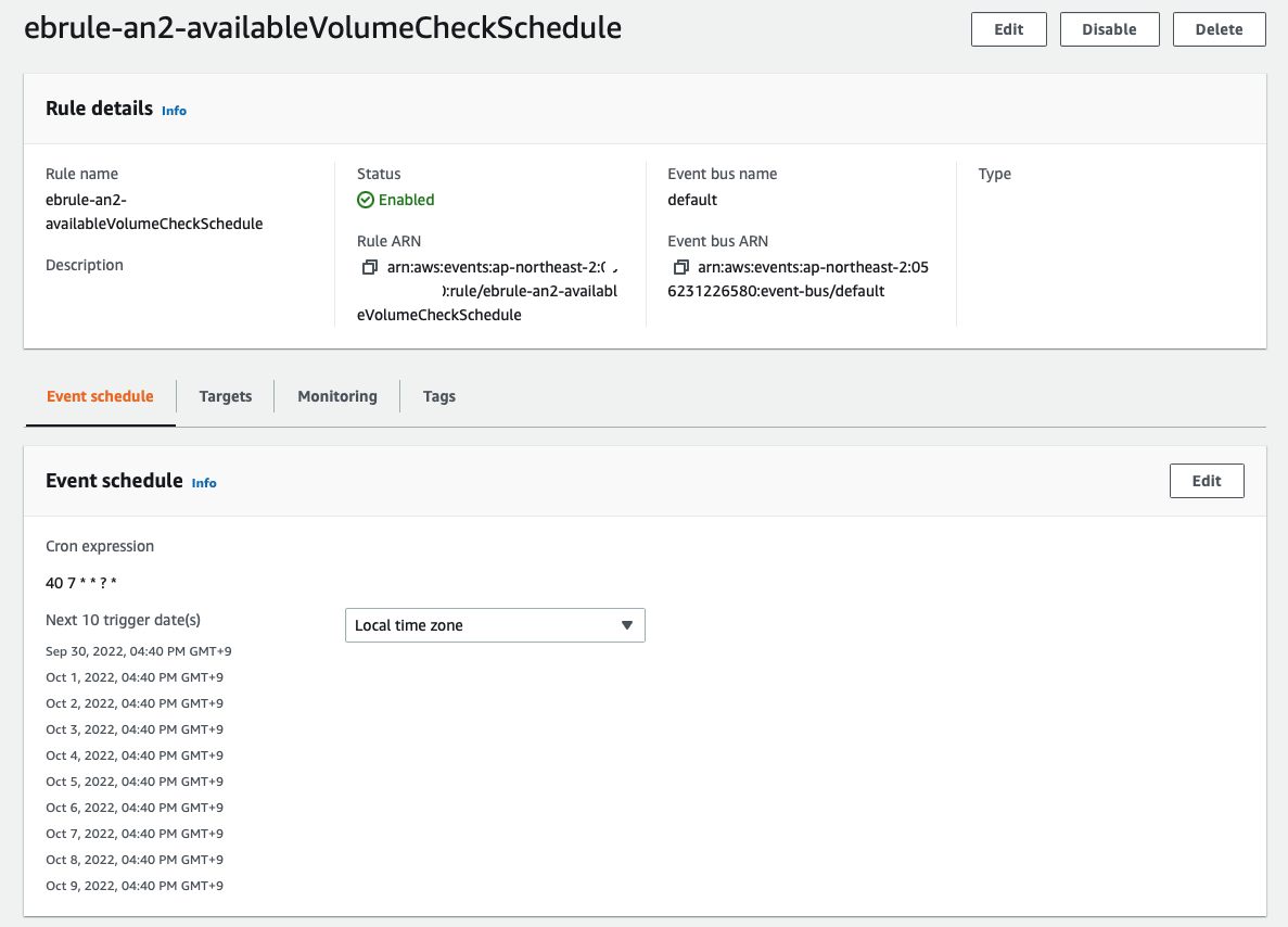 Lambda Function이 주기적으로 동작하여 Available 한 EBS를 확인하기 위하여 EventBridge를 사용하여 스케쥴을 작성합니다.