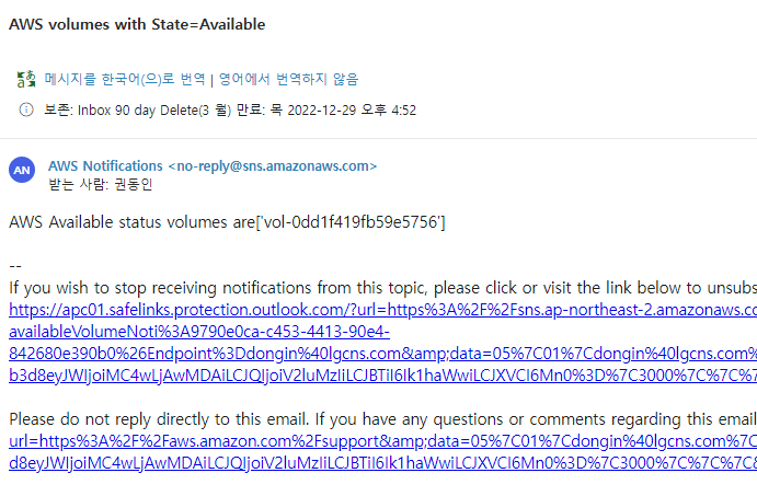 EventBridge의 스케쥴에 따라 Lambda Function이 동작하여 Available한 EBS Volumes을 확인하여 Amazon SNS를 통해 지정한 Email 주소를 통해 다음과 같이 어떤 EBS Volume이 유효한지 메일을 통해 정상적으로 전달됨을 확인할 수 있습니다.