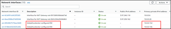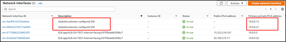 Internal Application Load Balancers를 Global Accelerator의 endpoint로 등록하는 경우, client IP address preservation은 항상 Enable 되며 이를 Disable 할 수는 없습니다. 아래와 같이 Application LoadBalancer가 속한 Subnet에 Elastic Network Interface가 각각 생성됩니다.