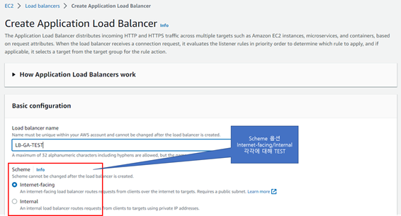 기타 VPC 등 기본적인 자원들을 모두 생성한 후, Application LoadBalancer의 경우 아래와 같이 생성 시 internet-facing으로 생성할지, internal로 생성할지 선택하여 각각 TEST를 진행합니다.