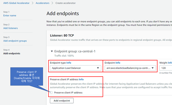 또한 구성에 따라 ALB 의 SG에 어떤 IP를 허용해야 하는지 고려하여 사전에 SG 설정에 허용해야 할 IP 대역을 허용하는 rule을 등록한 후 GA 설정을 진행하도록 합니다. 특별한 경우가 아니라면 Clinet IP를 GA 백엔드에서 확인할 수 있도록 GA 의 Preserve Client IP 설정은 Enable 하는 것을 권고합니다.