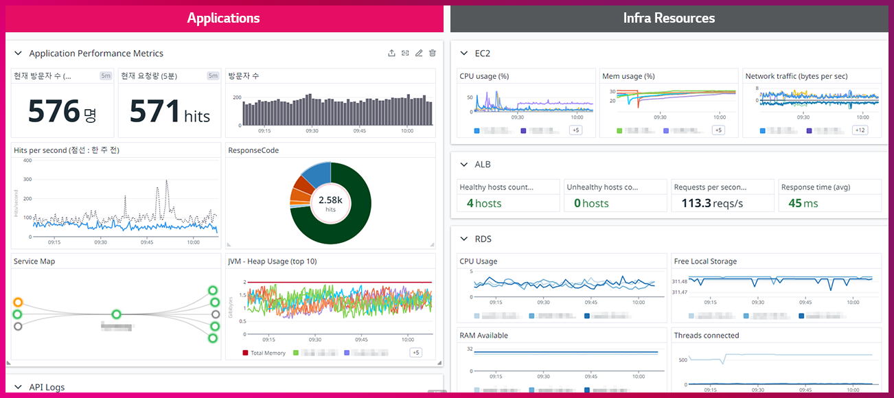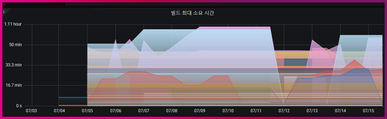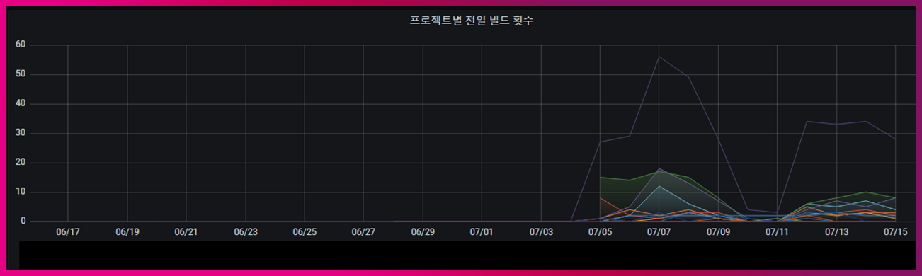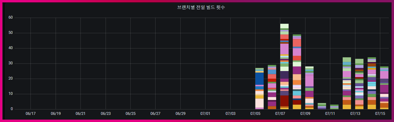 이렇게 구성된 파이프라인은 프로젝트 내 여러 애플리케이션에 있으며, 각 애플리케이션 안에서도 Branch 별로 구성된 CI/CD 파이프라인이 있습니다. 수많은 파이프라인들은 하루에도 몇 번씩 빌드를 수행합니다. 즉, 빌드의 성공/실패에 대한 관리뿐 아니라 변경 리드타임, 배포 빈도에 대해서도 모니터링은 필수입니다.