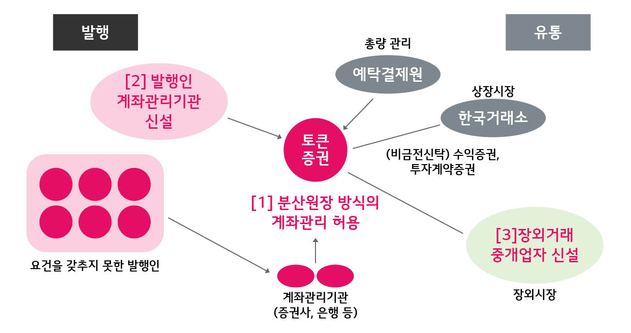 금융당국은 블록체인 기술을 통한 분산 원장 발행을 증권 발행의 한 방법으로 인정하고, ‘발행인 계좌관리기관’을 신설한다는 내용을 개정 전자 증권법에 담기로 했습니다. 발행인 계좌관리기관은 은행이나 증권사가 아니라도 일정 요건을 갖춘 사업자가 직접 토큰증권을 등록/관리할 수 있도록 허용되는 라이선스입니다. 그리고 자본시장법 개정안에 토큰증권을 유통하는 ‘장외거래 중개업’ 신설에 관한 내용도 포함했습니다. 이후 장외거래 중개 인가 신설, 소액투자자 매출 공시 면제, 디지털 증권시장 신설 등을 후속으로 담기로 했습니다.