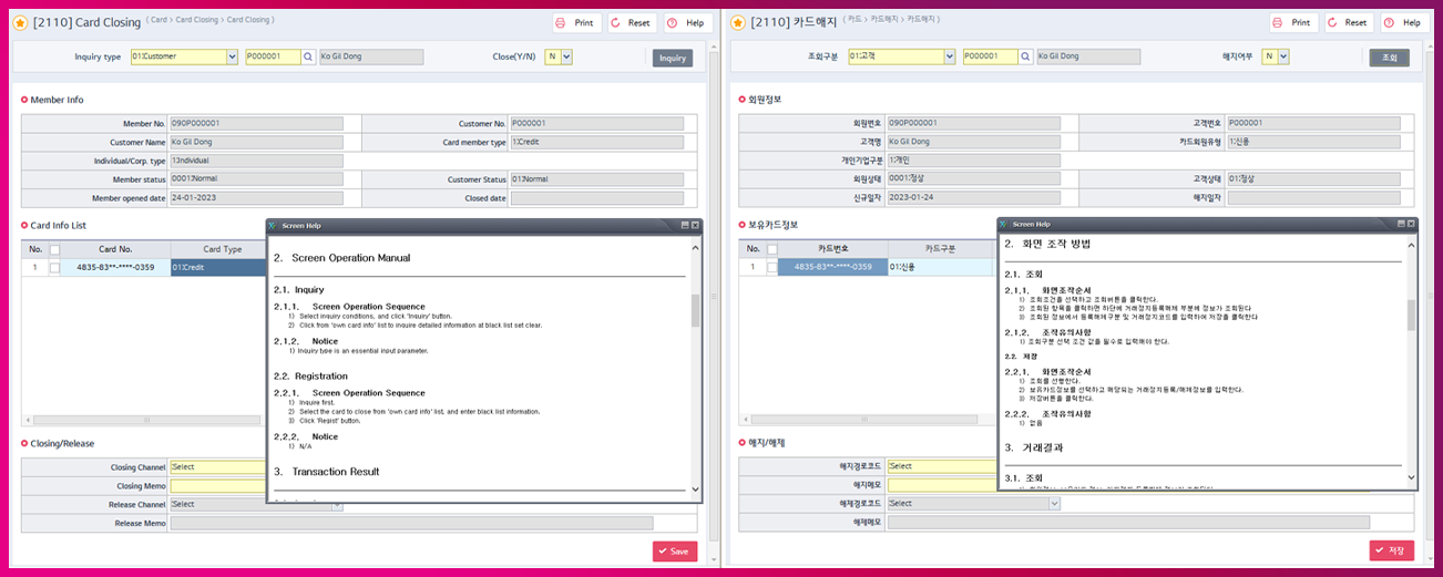 현지화 조건 중 하나는 현지 직원들이 이해할 수 있도록 적합한 화면을 구성하는 것입니다. LG CNS Card/Capital Perfect는 메뉴, 화면 레이블, 코드, 메시지 등 다국어가 필요한 화면 구성 요소를 메타 데이터 기반으로 처리합니다. 한국어와 영어는 물론 현지 언어를 메타에 등록하기만 하면 화면에서 자동으로 변환됩니다. 날짜 형식과 화면 도움말 또한 사용자가 로그인한 언어에 맞도록 변환 처리가 가능합니다.