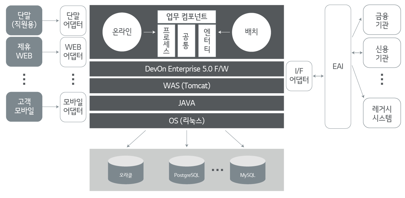 시스템 아키텍처는 채널, 응용 애플리케이션, DBMS(Data Base Management System, 데이터베이스 관리 시스템) 레이어로 구성돼 있으며, 대내외 인터페이스를 처리하기 위한 EAI(Enterprise Application Integration, 비즈니스 프로세스를 중심으로 기업 내 각종 애플리케이션 간에 상호 연동이 가능토록 통합하는 솔루션) 시스템이 별도로 구성돼 있습니다.