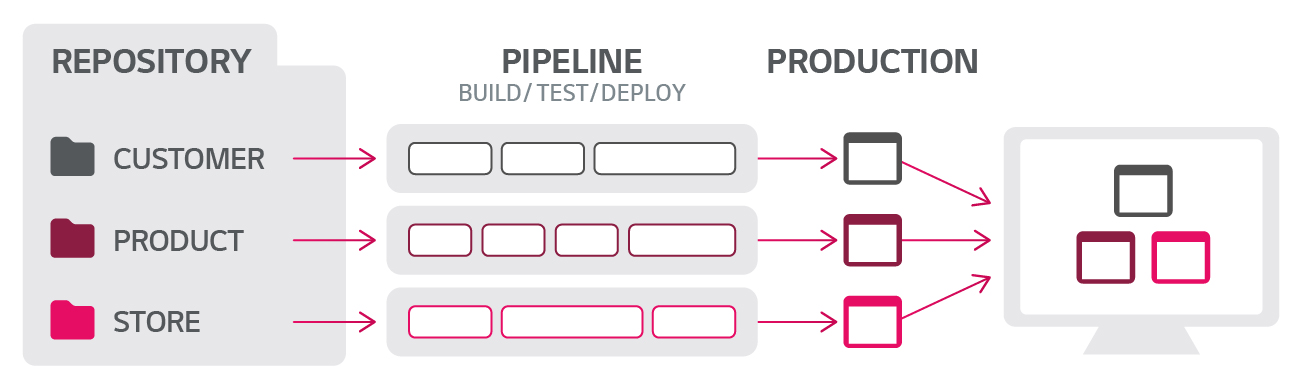 마이크로 프론트엔드를 구현하는 방식엔 여러 가지가 있지만, LG CNS는 모노레포(Monorepo)와 모듈 페더레이션(Module Federation)에 집중하고 있습니다. 모노레포란 하나의 레포지토리(Repository, 데이터를 저장하고 불러오는 로직을 담당하는 객체) 아래에 독립적인 하위 프로젝트를 함께 관리하는 방식을 의미하는데요. 모든 프로젝트의 소스 코드와 자원 간의 의존성을 쉽게 확인할 뿐만 아니라 한 번의 명령으로 레포지토리 아래 여러 프로젝트를 병렬로 빌드/테스트/배포할 수 있다는 장점이 있습니다.