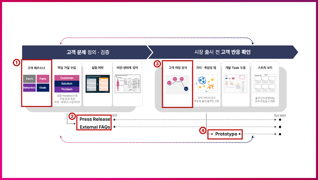 A. 새로운 상품이 한 번의 아이디어에서 나올 수 없듯이, 일단 Prototype을 통해 최소한의 기능만 갖춘 제품이나 서비스를 만들어 보는 것입니다. 이후 고객의 VoC (Voice of Customer, 제품 또는 서비스에 대한 고객의 경험, 기대치에 대한 피드백을 해 제품 및 서비스 개선에 활용)를 확인 및 반영하면서 지속적으로 보완하는 과정을 거치게 됩니다.