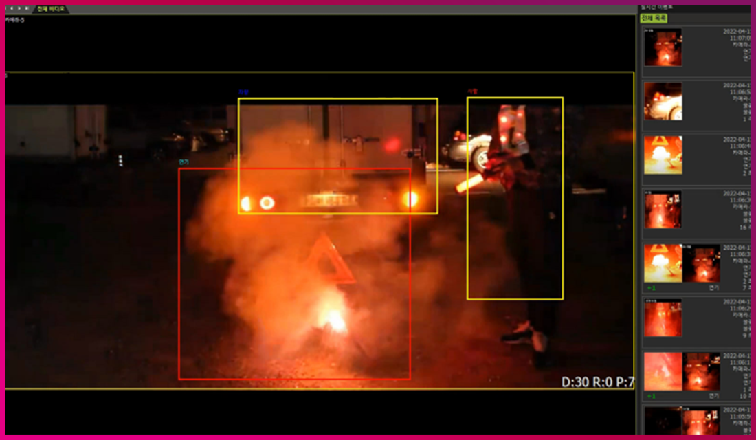 AI 영상분석은 CCTV에 들어오는 정보를 영상분석 서버를 통해 분석합니다. CCTV 영상 속 연기를 감지하면 알림이 울리고, 진행 상황을 실시간으로 모니터링할 수 있는데요. 개체 분석을 통해 남겨지거나 쓰러진 사람이 없는지 파악이 가능해 안전 대피 및 구호 조치에도 유용합니다.