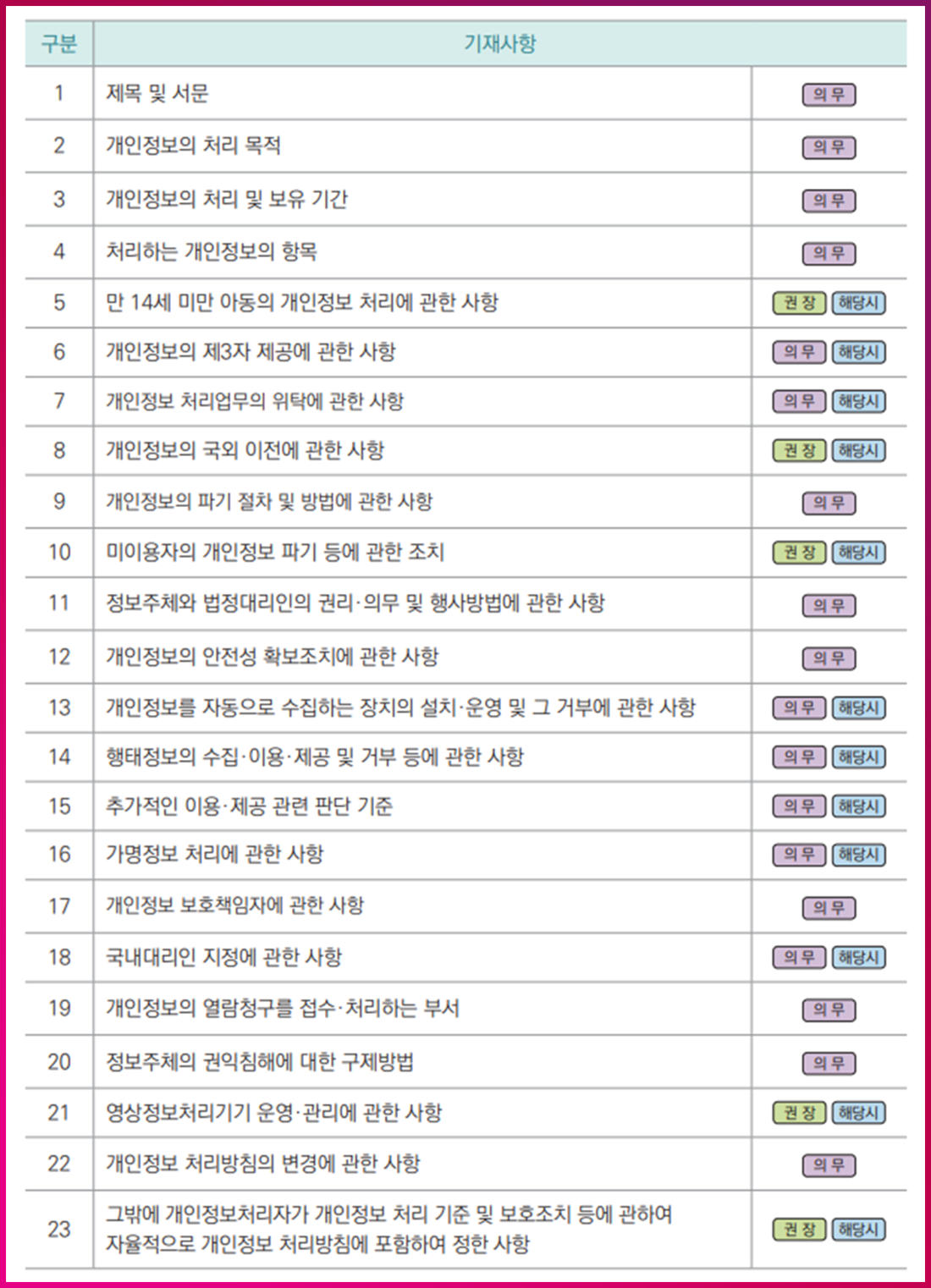 인터넷을 이용하다 보면 사이트 하단이나 게시판에 게시된 개인정보 처리방침을 쉽게 접할 수 있습니다. 개인정보 처리방침은 이용자가 안심하고 서비스를 이용할 수 있도록 기업/사업자가 준수해야 할 지침을 의미하며, 개인정보보호법 제30조에 따라 모든 개인정보처리자는 개인정보 처리방침을 수립 및 공개할 의무가 있습니다. 개인정보 보호법에서는 개인정보 처리방침에 반드시 포함해야 할 내용을 [그림 1]과 같이 규정하고 있습니다. 이번 글에서는 개인정보 처리방침 작성 시 놓치기 쉬운 부분들을 짚어보고, 올바른 작성 가이드를 소개해 드리겠습니다.