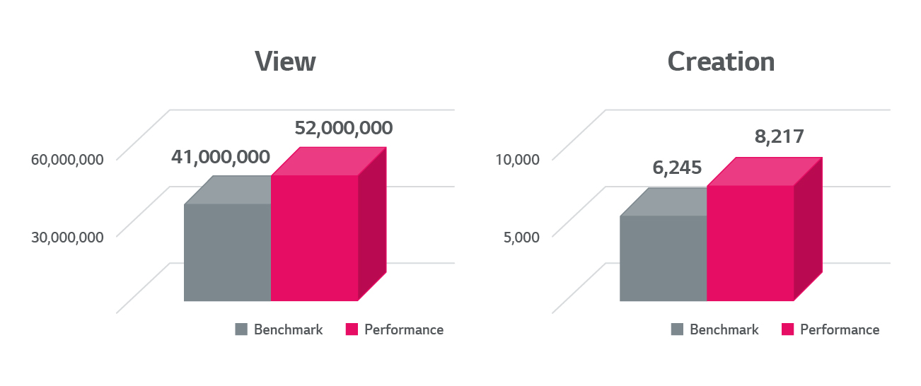 2023년 1분기 Tik Tok 벤치마크(성과를 비교·평가하기 위한 기준이 되는 성과정보) 성과를 확인해 본 결과, LG Life’s Good 캠페인은 벤치마크 대비 1.27배 높은 5,200만 조회수와 벤치마크 대비 1.31배 많은 8,217개의 Creation(캠페인을 통해 확산된 게시물의 수)을 기록했습니다.