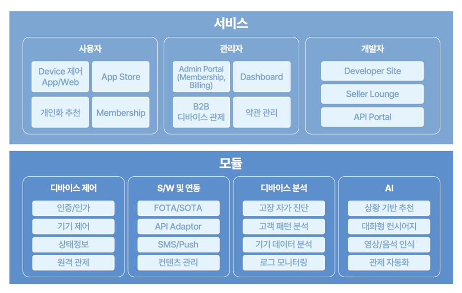 단순히 디바이스를 연계하기 위한 개념에서 시작되었던 디바이스플랫폼이 디바이스간의 연결에 한정하지 않고 고객과의 연결도 중요시함으로써 다양한 가치와 서비스를 제공하게 된 것입니다. 그 결과, 다양한 컨텐츠 서비스와 연계할 수 있게 되었으며, AI 서비스와의 연계를 통해 높은 수준의 대화형 서비스를 손쉽게 구현하여 제조사의 브랜드 가치를 높이는 것도 가능해졌습니다. 또한 플랫폼의 SDK(Software Development Kit, 소프트웨어 개발도구 모음)를 제공하여 제조사가 아닌 개발자가 직접 선순환 되는 생태계를 구축하는 것도 가능해졌습니다.