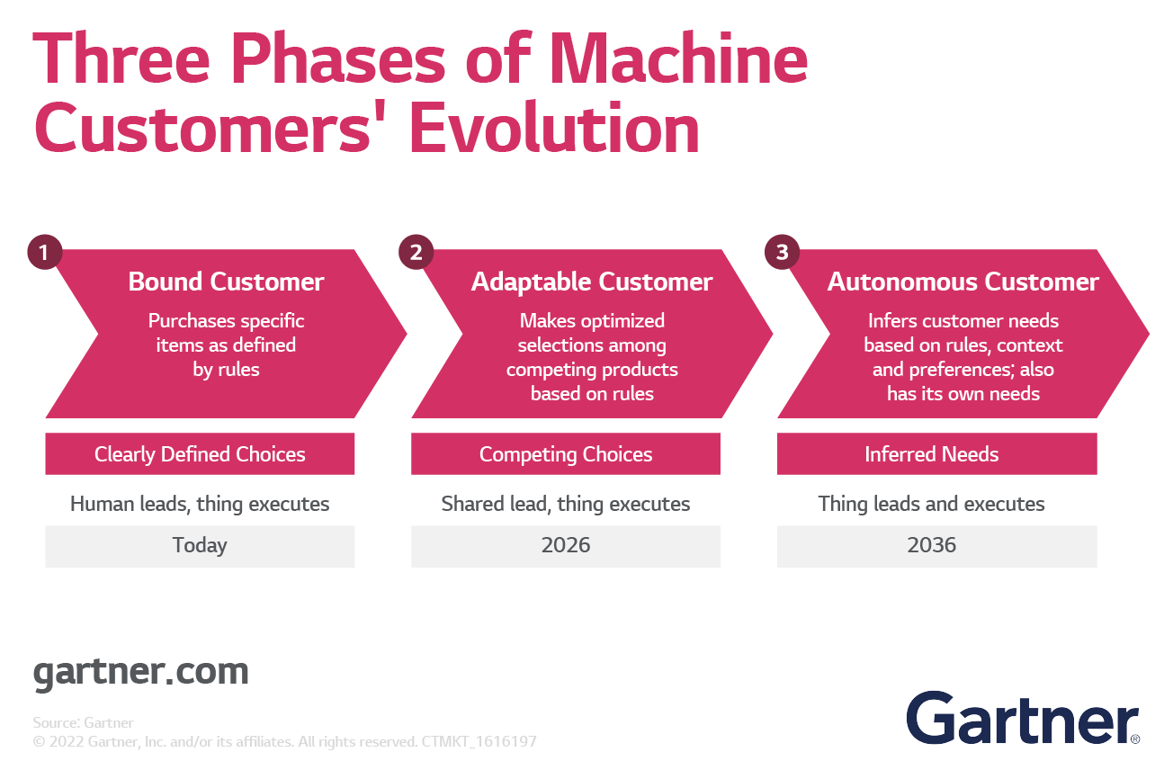 가트너는 기계 고객이 Bound Customer, Adaptable Customer, Autonomous Customer를 거쳐 진화할 것이라고 설명했습니다.
