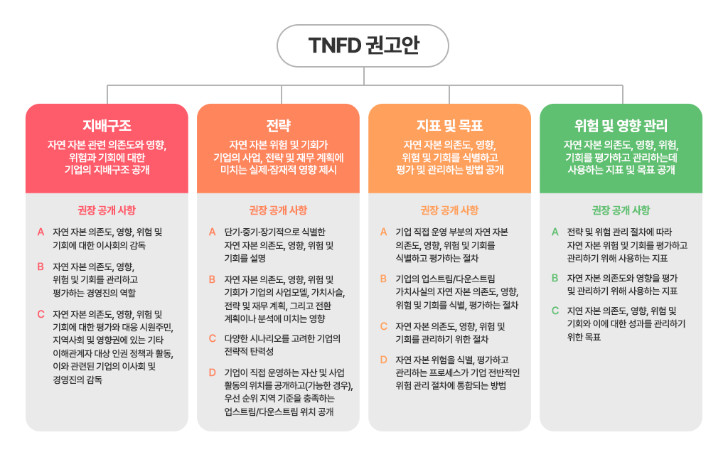 TNFD는 기업에게 자연 자본에 대한 위험을 평가하고 공시하는 방법에 대한 국제적 표준을 제공하며, 기업이 생물다양성에 대한 위험을 지속적으로 관리하고 이해관계자들과 공유할 수 있도록 도움을 줍니다. TNFD가 기업에게 제시하는 권고안은 ‘지배구조, 전략, 리스크 및 영향 관리, 지표 및 목표’라는 네가지 핵심 주제 아래 14개의 세부 항목으로 구성되어 있습니다.