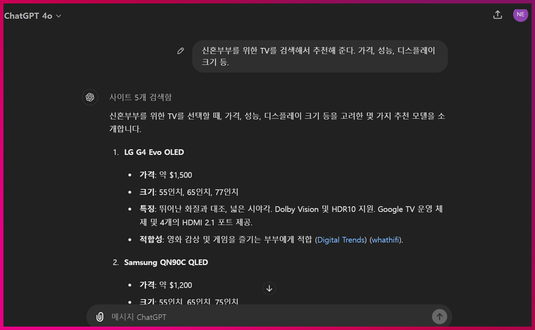 오픈AI가 새로운 언어 모델인 GPT-4o를 지난 5월 출시하면서, 강력한 검색 기능을 함께 도입했습니다. 기존 GPT-4에서는 자체적인 웹 검색 엔진은 제공되지 않았습니다. 만약 상세 웹 검색이 필요한 경우, 마이크로소프트 빙(Bing) 검색 엔진을 거쳐야 했습니다. 하지만 신규 버전인 GPT-4o는 웹 검색 기능을 통합했습니다. 예를 들어 “LG CNS 블로그 콘텐츠 내용을 바탕으로 인공지능에 대해 알려줘”라고 챗GPT에게 요청하면, 챗GPT가 웹사이트에 접속해 관련 내용을 분석해 요약해줍니다.