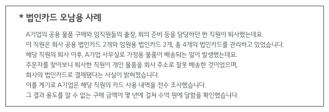 경비 관리 자동화 시스템은 개인 카드와 법인카드 사용 내역을 실시간으로 연동하고, 현금영수증과 세금계산서 등 다양한 증빙 서류를 디지털화해 통합 관리하는 시스템인데요. 수작업으로 진행되던 경비 정산 프로세스를 간소화하고, 업무 효율성을 크게 높이는 중요한 도구로 자리 잡고 있습니다. 하지만 자동화 시스템은 오류나 부적절한 사용을 완전히 방지할 수 없다는 한계가 있는데요. 이를 악용해 경비를 부적절하게 사용하는 사례가 발생하고 있습니다. 가장 흔하게 접할 수 있는 사례로 법인카드의 오남용 등이 있는데요.