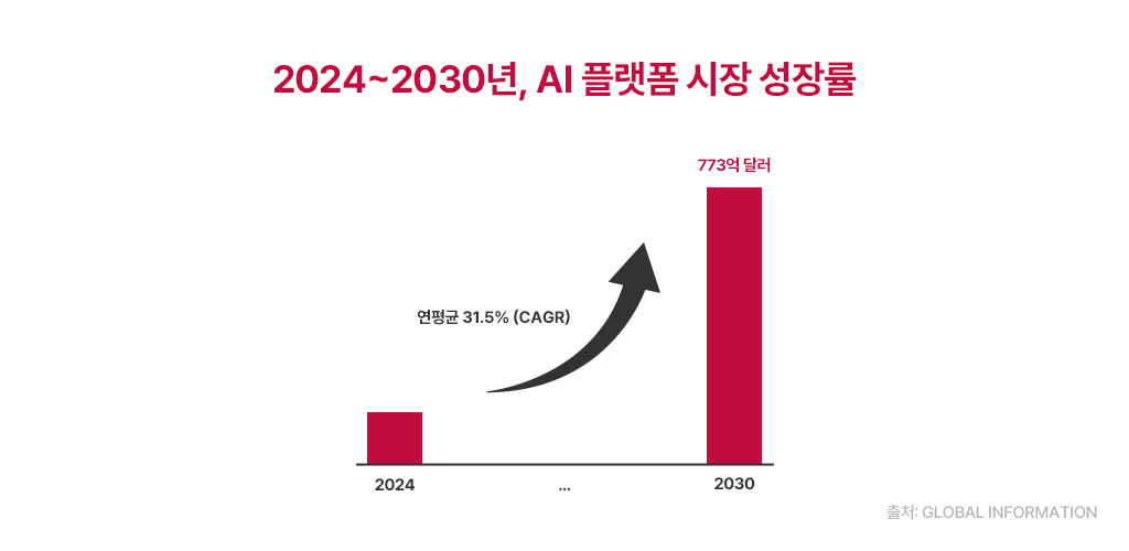 Global Information의 시장 조사에 따르면, AI 플랫폼 시장은 2024년부터 2030년까지 연평균 31.5%의 성장률(CAGR)을 기록하며, 2030년에는 총 773억 달러 규모에 이를 것으로 전망됩니다.1) 이는 AX 시대에서 AI 플랫폼이 단순한 선택을 넘어 필수 요소로 자리매김할 것임을 보여줍니다.