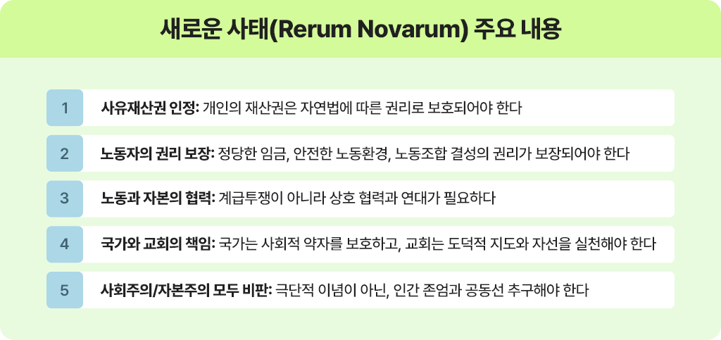 이를 토대로 레오 14세가 계승하겠다고 밝힌 레오 13세의 Rerum Novarum을 살펴보면, AI 시대의 이슈 방지를 위한 내용과 연결된다는 것을 알 수 있습니다. Rerum Novarum은 노동하는 인간의 존엄성을 강조하며, 자본주의와 사회주의의 극단을 모두 비판하고 있습니다. 그리고 인간다운 노동, 사회 정의, 연대, 자비를 가톨릭 신앙의 사회적 원리로 제시하고 있습니다.