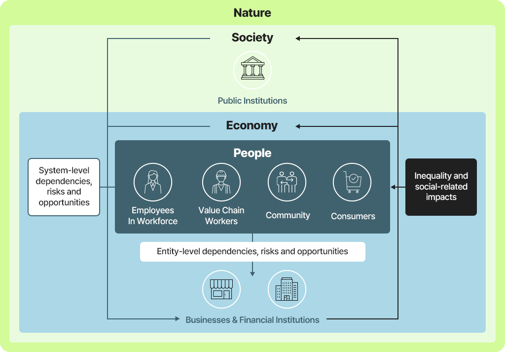 그리고 아래 도식은 경제 영역에서 사람과 기업, 금융기관이 맺는 영향, 의존, 위험, 기회 관계뿐 아니라, 사회 영역의 공공기관(Public Institutions)과의 상호작용까지 포괄적으로 제시합니다. 기업이 미치는 직접적 영향은 물론 공급망, 제품 및 서비스의 이용, 지역사회와의 관계에 이르기까지 폭넓게 고려하고 있음을 보여줍니다. 특히, 이 모든 관계를 둘러싸고 있는 것이 자연(Nature)이라는 점에서 기후·자연·사람에 대한 TCNF·TNFD·TISFD가 유기적으로 연결되어 있음을 알 수 있습니다. 또한 세 이니셔티브 모두 재무적 공시(Financial Disclosure)를 핵심 원칙으로 삼고 있다는 점에서, TISFD 역시 ESG 경영이 본질적으로 지니는 투자·재무 관점을 공유하고 있음을 확인할 수 있습니다.