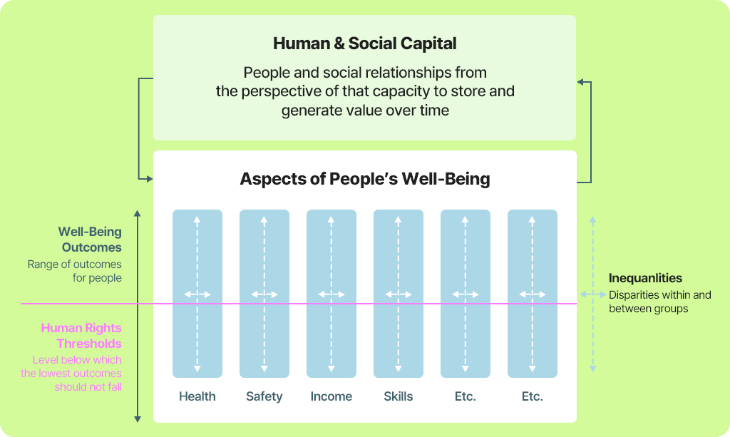 이러한 웰빙과 인권은 인적자본 및 사회적 자본과 상호작용하며, 이때 인적자본과 사회적 자본은 사람과 사회의 관계로써 Capacity(능력) 관점에서 시간이 지남에 따라 얼마나 많은 가치를 창출할 수 있는지를 결정하는 핵심 요소로 정의됩니다.