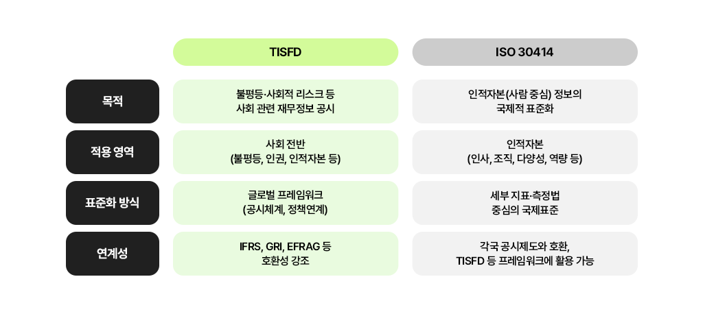 IFRS는 이미 TCFD 권고안을 S2(기후 공시 표준)에 통합했으며, 곧 새롭게 발표될 공시기준인 S3(자연자본·생물다양성 공지 표준)에 TNFD 권고안을 반영할 예정입니다. 이 같은 흐름에 비추어 볼 때 TISFD 역시 새로 마련될 S4(인적자본) 기준에 포함될 가능성이 높습니다. 실제로 TISFD 출범 당시, 시장과 이해관계자들은 TISFD가 ISSB(International Sustainability Standards Board) 인적자본 기준 등과 협력해 별도의 프레임워크가 아닌 통합 글로벌 공시 표준의 일부가 되기를 기대했습니다.