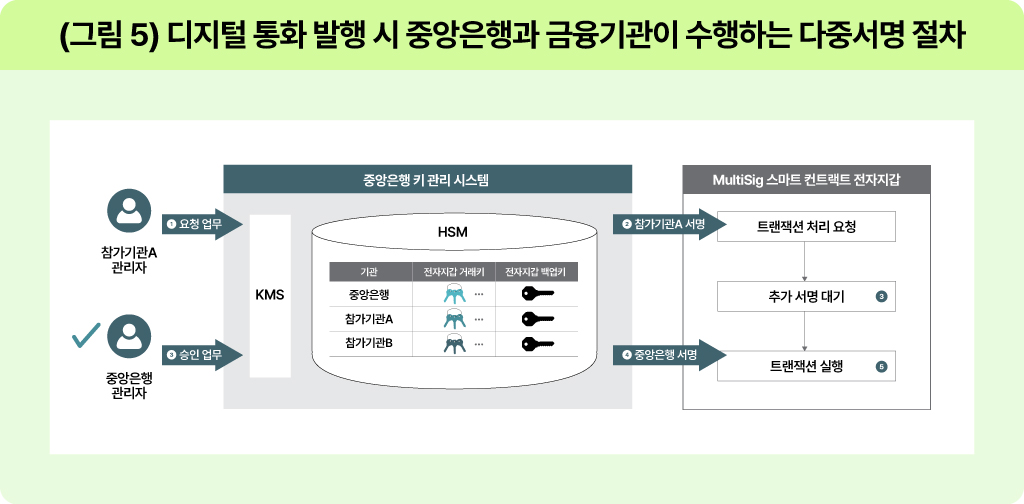 이 지갑 시스템은 기존 금융 레거시 시스템과 마찬가지로 임직원을 위한 사용자 인증 및 접근 통제 체계를 기반으로 구축됩니다. 각 관리자는 KMS를 통해 자신의 권한에 따라 서명하고, 스마트 컨트랙트 지갑은 여러 관리자의 서명을 취합하여 하나의 발행 트랜잭션을 완성합니다. 예금토큰 등 민간 디지털 통화를 발행하는 경우에도 중앙은행의 최종 서명이 있어야 발행이 가능하도록 설계되어 있습니다.