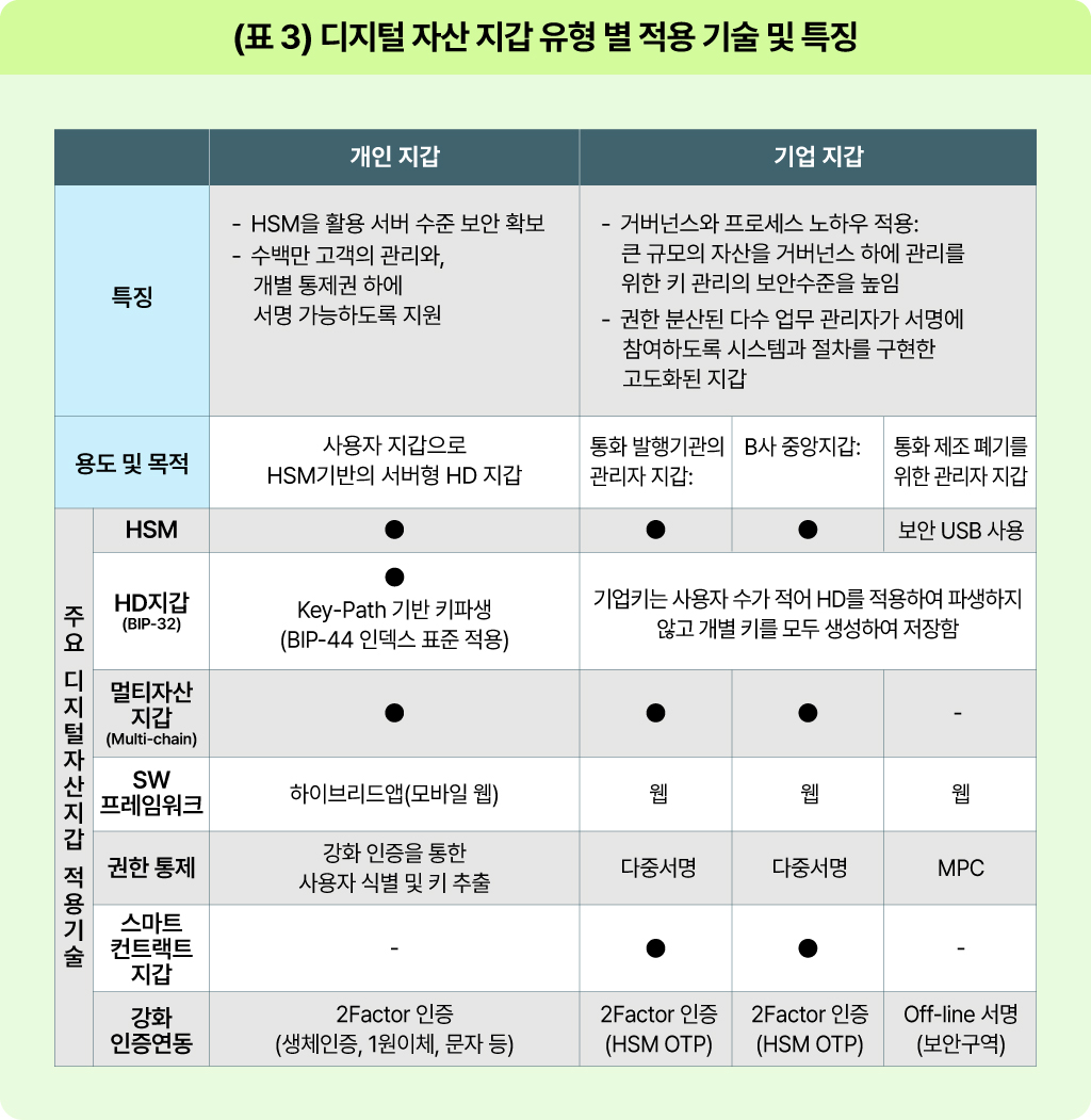 (표 3)은 디지털 자산 지갑 사례를 용도와 목적에 따라 구분하고, 각 지갑을 구현하기 위해 적용된 기술의 특징을 정리한 내용입니다. 먼저 HSM은 키를 보다 안전하게 관리하기 위한 목적으로 활용되며, 개인 지갑의 경우 HD 지갑 개념을 결합하여 HSM 내부에서 다수의 키를 파생·서명하는 방식을 통해 비용 효율성과 사용자 편의성을 동시에 확보했습니다.